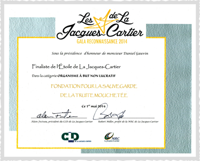 La Fondation pour la sauvegarde de la truite mouchetée est très heureuse d'avoir été finaliste pour la toute première édition de l'Étoile de la Jacques-Cartier dans la catégorie « Organisme à but non lucratif » lors du Gala Reconnaissance 2014 organisé par la MRC et du CLD de La Jacques-Cartier.