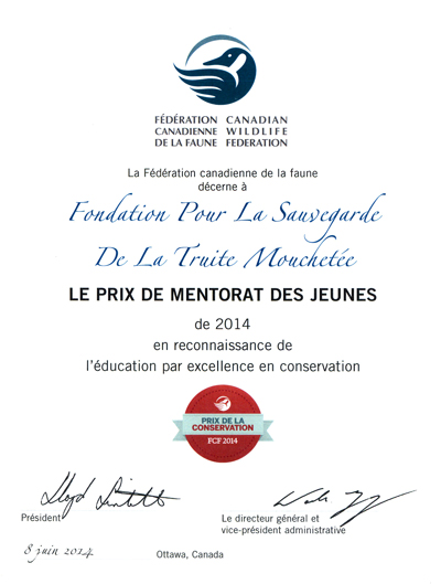 C'est avec beaucoup de fierté que la Fondation pour la sauvegarde de la truite mouchetée a reçu le Prix de mentorat des jeunes décerné par la Fédération canadienne de la faune (FCF) lors de son Banquet des prix le samedi 7 juin 2014 à Winnipeg au Manitoba.