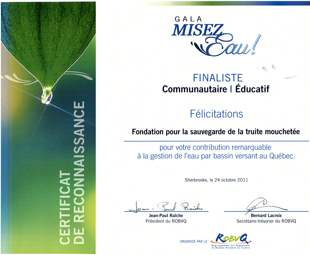 La Fondation pour la sauvegarde de la truite mouchetée est très fière d'avoir été finaliste au premier Gala Misez EAU ! dans la catégorie « Communautaire / Éducatif » organisé par le Regroupement des organismes de bassins versants du Québec (ROBVQ) dans le cadre du Rendez-vous international sur la gestion intégrée de l'eau.